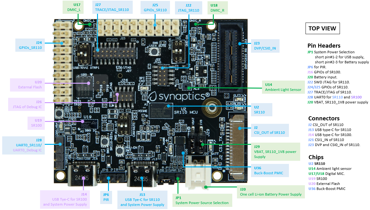 2 ร USB 2.0 Type-Cโข ports: One for SR110 Audio & Vision processor, other for Debug IC. Both provide system power.