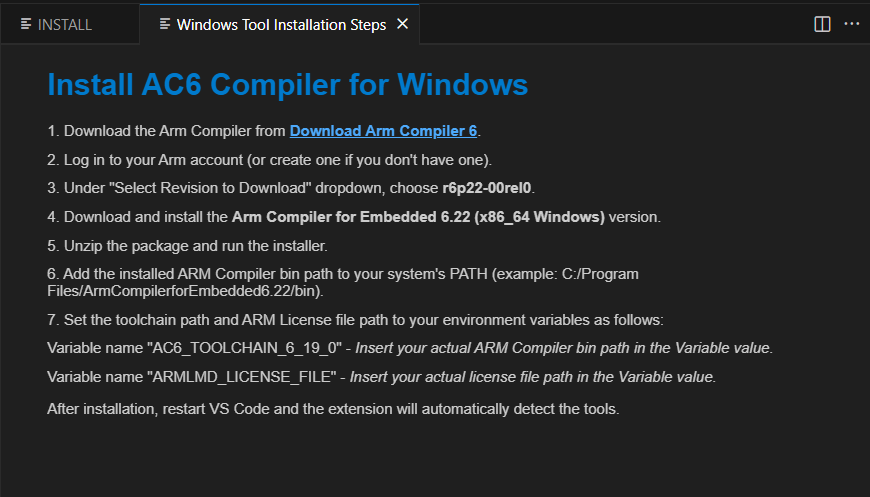 Arm Compiler 6 requires manual installation due to licensing constraints. Follow the steps shown in the Tools Installer webview.